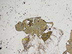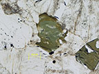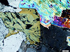 Tourmaline crystal in plane polarized light and cross polarized light. Tourmaline, the olive-green colored grain, presents zoning. Click on the link for a PPL and XPL rollover view. |