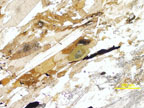 Tourmaline crystal oriented with long grain direction parallel to polarizer in plane polarized light. Minimum absorbance observed. Click on the link to see change color as grain is rotated so that its long direction is perpendicular to the E-W polarizer direction in the rollover view. |