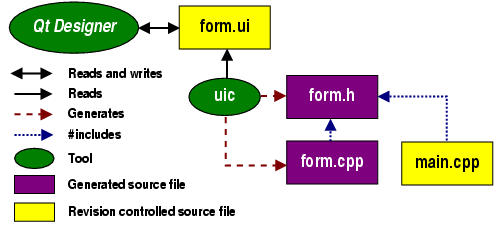 [Prev: Creating Dialogs] [Home] [Next: Subclassing and Dynamic Dialogs] The Designer ApproachIntroductionIn Qt 2.x, Qt Designer was a visual form designer for editing files in the .ui file format. Qt Designer's primary goal was to turn the most tedious part of GUI programming -- dialog design -- into a pleasant experience. From an architectural point of view, Qt Designer in 2.x is a fairly simple program. It reads and writes .ui files. Each .ui file contains an XML description of a single dialog form. A second utility -- the user interface compiler uic -- is used during the build process of an application to generate C++ code from those XML descriptions. For Qt 3.0 our ambitions for Qt Designer have grown beyond single dialog editing. In addition to many new design features like the ability to creating main windows and actions, the new version introduces:
