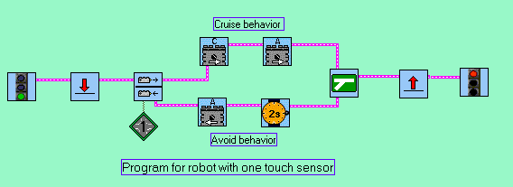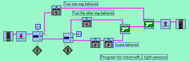 | Remove the touch sensor and add two light sensors to your robot, directed at the ground. Program your robot so that it will follow a black line on a white background. Put the sensors far enough apart from each other so that they can straddle the black line and be able to "see" the white background on each side at the same time. |