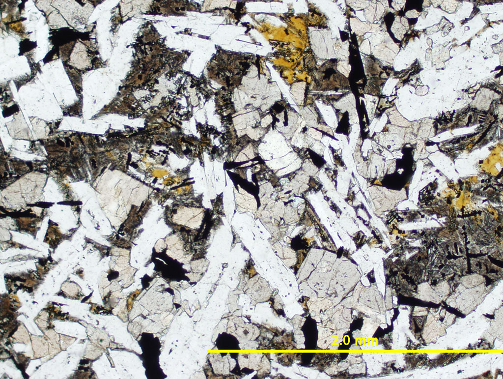 Figure 4.02. Basalt thin section in plane polarized light (PPL). Notice that it consists of several minerals: plagioclase laths (clear), clinopyroxene (beige), olivine (clear but equant), opaque minerals (magnetite and ilmenite), and "mesostasis" (partially devitrified glass). Click on the image to see a larger version with the option of a cross-polarized light (XPL) view.