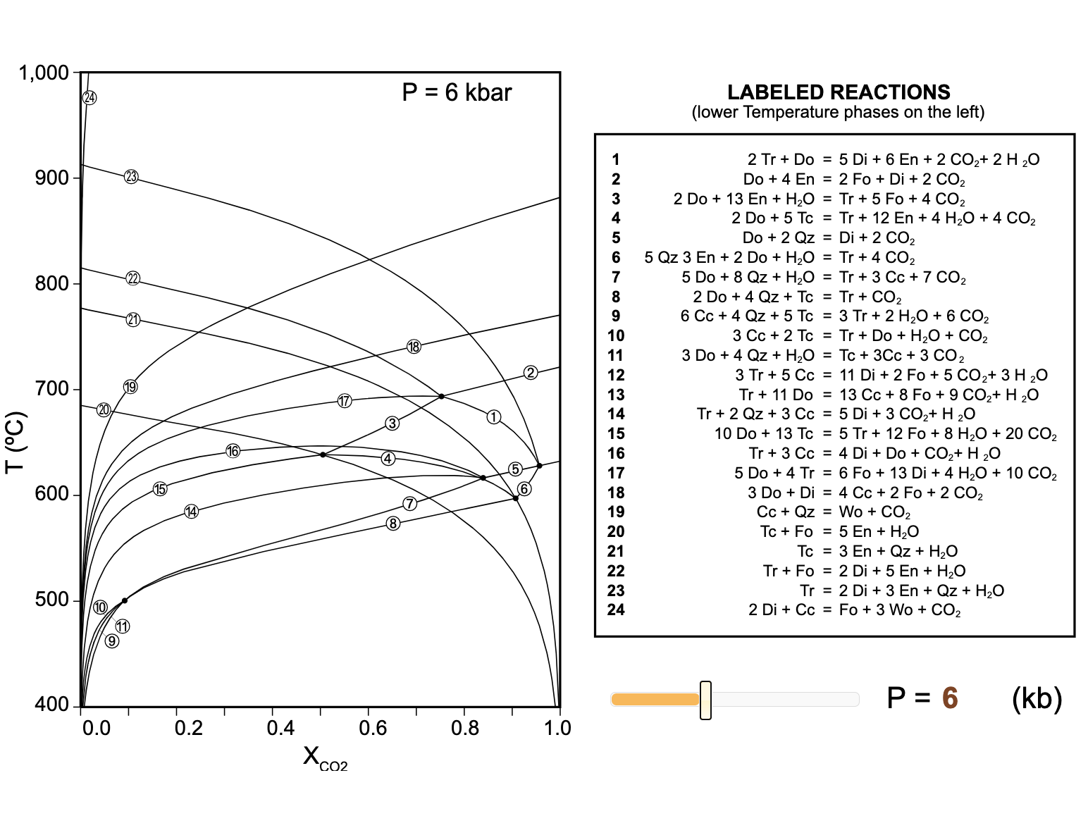 Reactions and Assemblages . Click on the image to see a T-P diagram with chemical reactions and generalized SCM mineral assemblages for metamorphosed carbonate silicate rocks as a function of temperature, pressure, and XCO2.