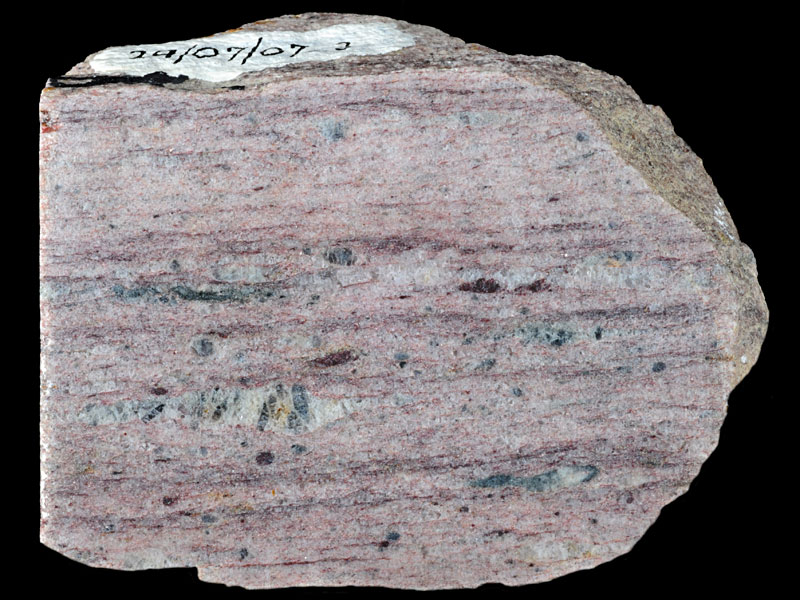 SpsPmtQuartzite: A metamorphosed sandstone with reddish garnet (spessartine) and piemontite.