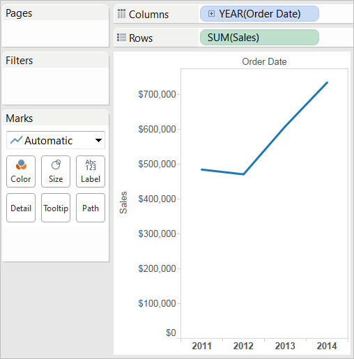 Tableau aggregates Sales as SUM and displays a simple line chart.
