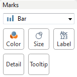 A bar chart uses the Bar mark type. Tableau selects this mark type when the data view matches one of the two field arrangements shown below. You can add additional fields to these shelves.