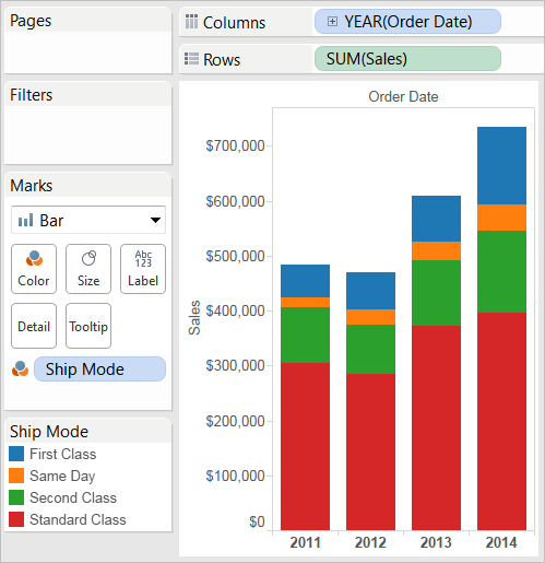 Drag the Ship Mode dimension to Color on the Marks card.