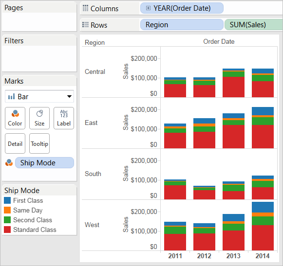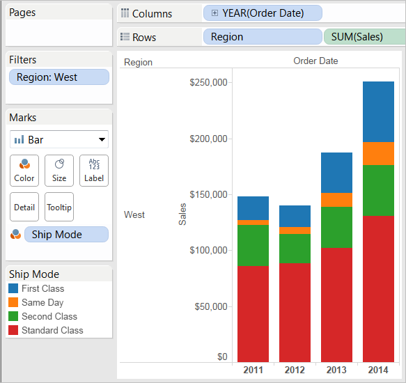 This view gives you insight into your data—for example, how the ship mode changed in the West over the four-year period.