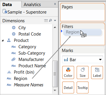 To view data in the West region only, you can filter out the other regions. To do this, drag the Region dimension again, this time from the Data pane to the Filters shelf.