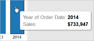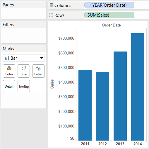 The marks (which are bars in this case) are vertical because the axis is vertical. The length of each mark represents the sum of the sales for that year. For example, the sum of the sales in 2014 is $733,947, which you can verify by hovering over that column.