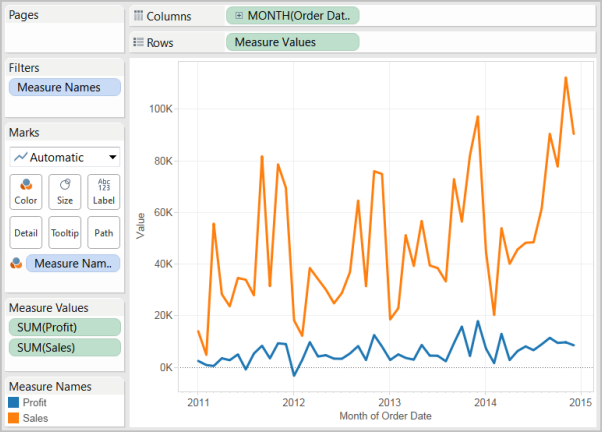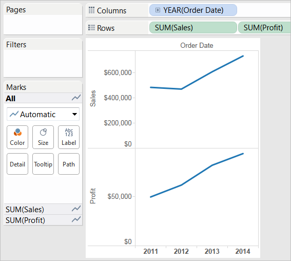 Tableau creates separate axes along the left margin for Sales and Profit.