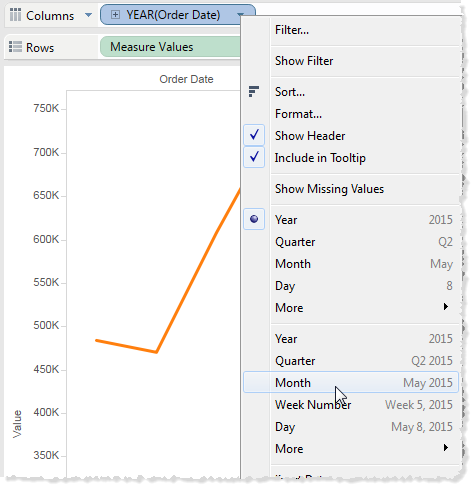 Click the drop-down arrow in the Year(Order Date) field in the view and select Month in the lower part of the content menu to see a continuous range of values over the four-year period.