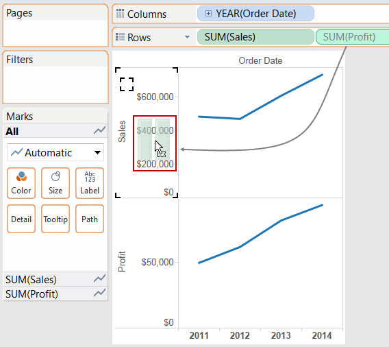 Drag the SUM(Profit) field from Rows to the Sales axis to create a blended axis. The two pale green parallel bars (shown in the red box) indicate that Profit and Sales will use a blended axis when you release the mouse button.