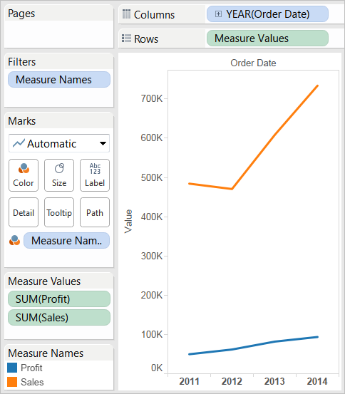 Drag the Profit measure to Rows and drop it to the right of the Sales measure.
