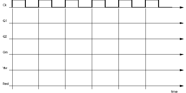 Record the timing diagram of the variation of the clock signal, Q1, Q2, Green, Yellow, and Red, when the switch is activated (first timing diagram), and when it is not (second timing diagram).