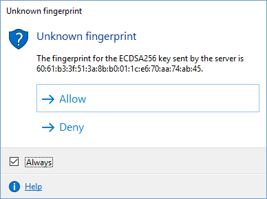 After hitting Connect you will most likely see a message warning that the server you are connecting to has an unknown fingerprint. This just means that your computer cannot automatically verify its identity for you. You can click Allow.