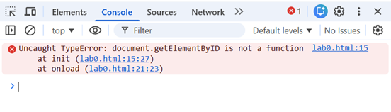 Web technology is designed for users, not developers. That means that you need to go to some extra effort in order to see the sort of information that would normally be provided by your IDE. To demonstrate this, let's add a deliberate error to our page. Back in the editor window, inside the function init, change getElementById to getElementByID (with a capital D, an easy mistake to make) and save the file again. Then go to the browser window to look at the page. (You could also select View with Live Server again, but this would open a second window on the same file, and one is probably enough.)