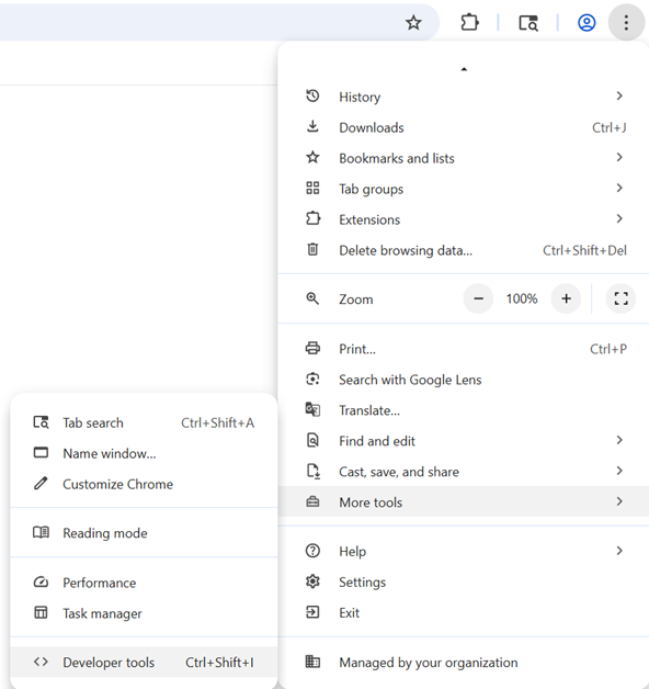 On many browsers you can open the developer tools by hitting the F12 key. On Chrome it is also available through the three-dot menu on the upper right: choose More Tools (you may need to scroll down the menu to see it), then Developer Tools. This should open a subwindow on the right side of your screen. You're almost there! The last step is to locate the tab called Console and click on it. At last, we can see the error message that explains why the text isn't rendering.