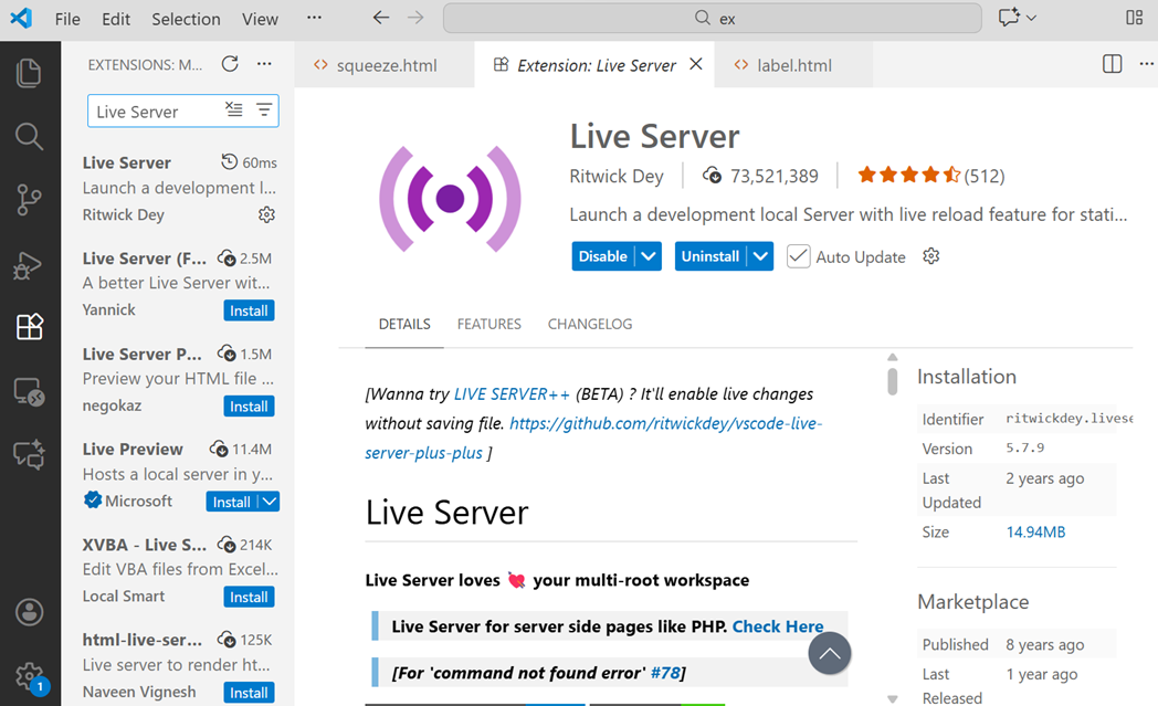 Install VS Code if you have not done so already. When you open the app, you should see a column of icons down the left side of the window. Click on the one that looks like a stck of boxes (Extensions) and in the search box type Live Server. Look for the version by Ritwick Dey as shown below and install it.